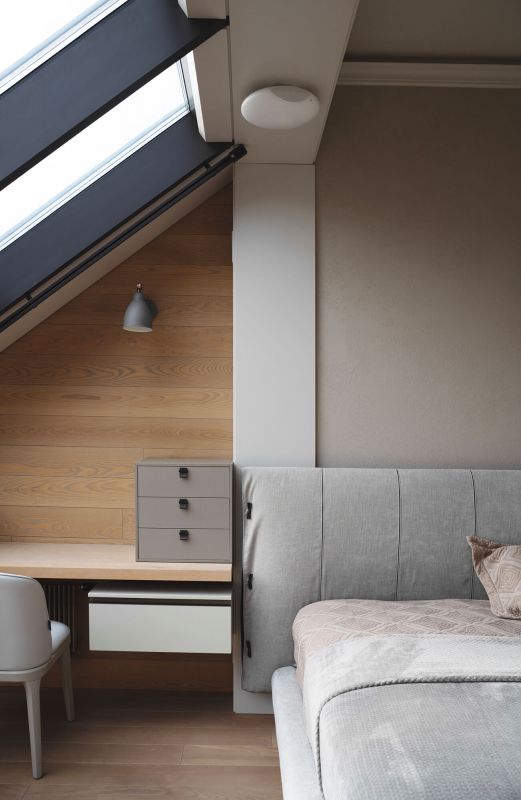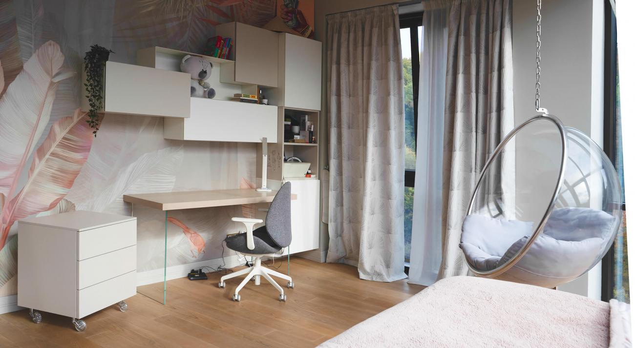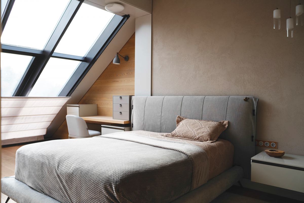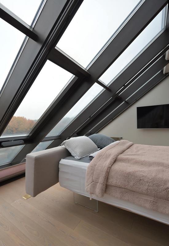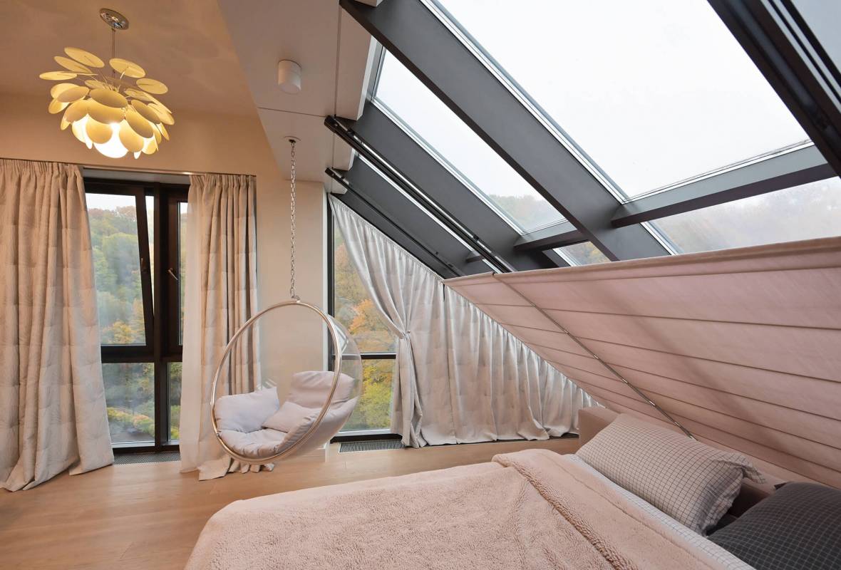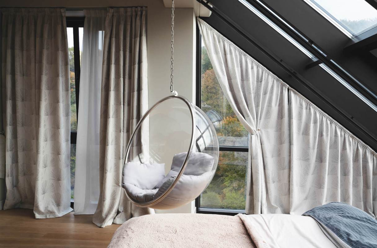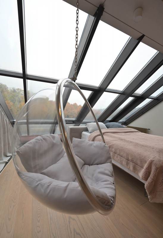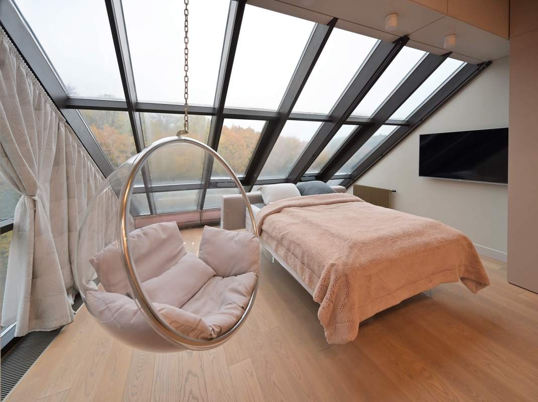 Обе спальни этой квартиры расположены под наклонным фасадным остеклением с видом на природный парк. Взрослая спальня выполнена в современном нейтральном стиле с использованием натуральных поверхностей и в приглушенных тонах. В детской применили мебель, «оторванную» от пола: парящую кровать, рабочий стол со стеклянными опорами и подвесное прозрачное кресло-шар, которое стало изюминкой интерьера.
